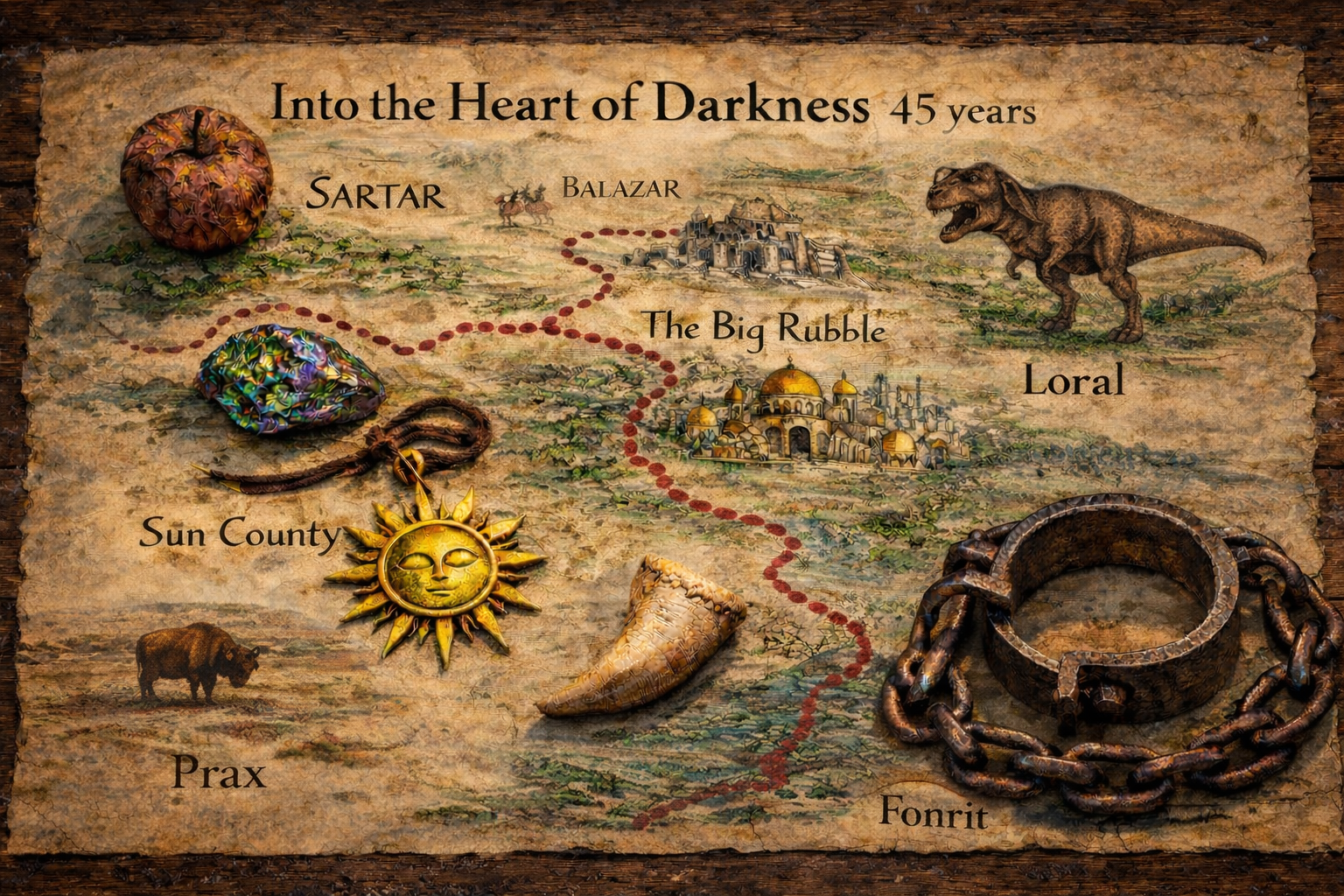 The journey began in the shadows of Apple Lane and plunged into the choking darkness of Snakepipe Hollow. The winds of Balazar tore at cloaks. From the vampire-haunted Dwarf Mine the company fled toward the Borderlands, where dust worked its way into leather and bone alike. Along the River of Cradles they drifted onward, drawn toward trial after trial. In the harsh light of Sun County, coins changed hands quickly, taken from Lunars and lost just as quickly in Gimpy’s tavern.