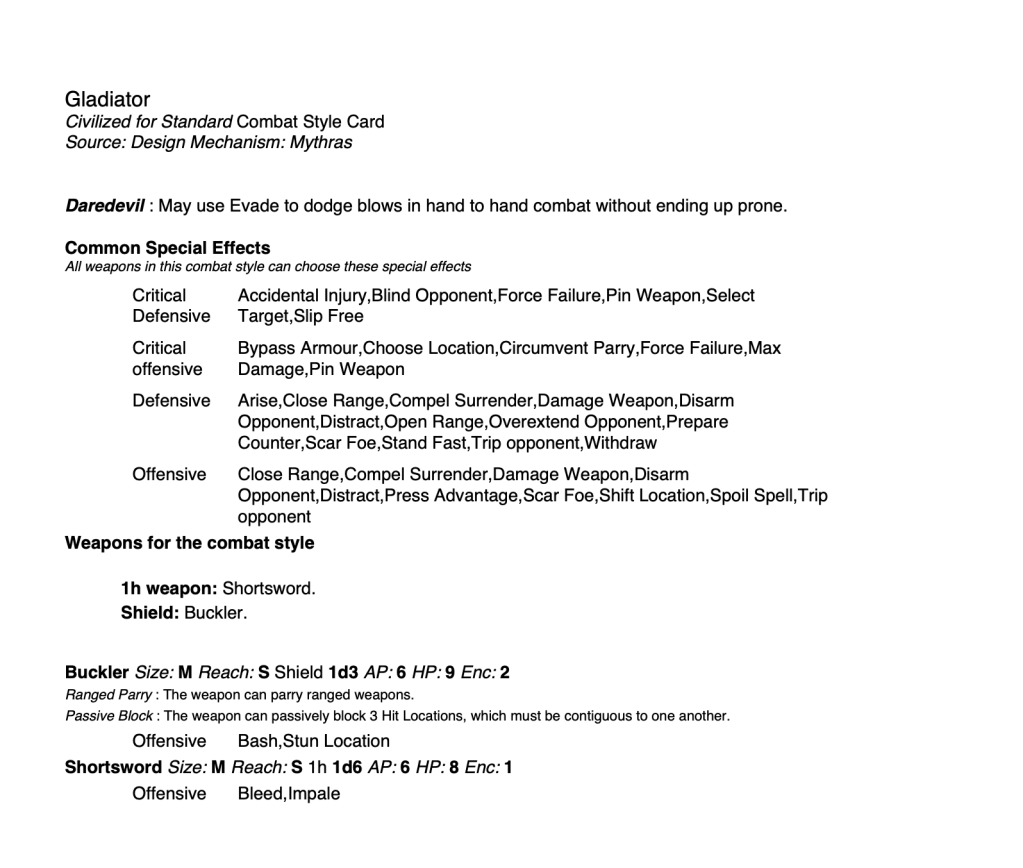 Combat styles, combat style traits, weapon traits and special effects are key parts of what makes Mythras so interesting in combat. I decided to make a player aid for my campaign that contains the key information for players about combat style they have chosen.