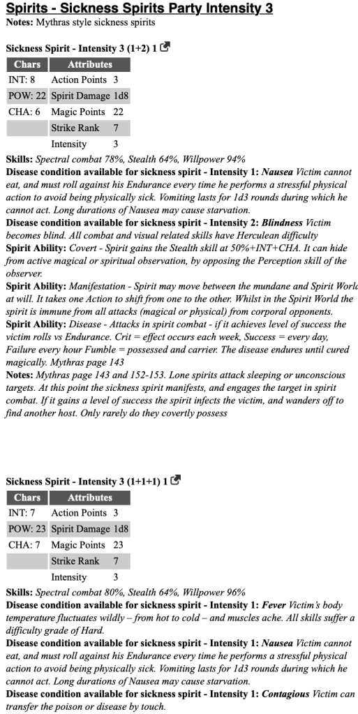 So what changes – Spirits will use newly refactored Spirit Abilities feature and use all of the Spirit Abilities from Mythras (3rd printing). They will use them by having them as “Spirit Abilities” feature in individual spirits. For the sickness spirits this will mean that they have Covert, Manifestation and Disease feature with references to the rulebook where necessary. All of the artefacts of older rules and MeG feature workarounds are updated to the current feature set. For example in earlier rule sets there was onset time for sickness to start, now that does not exist in current rule sets for spirits.