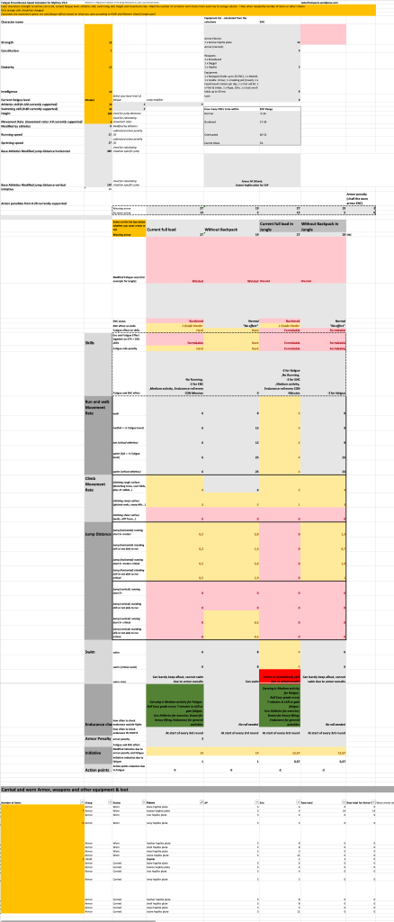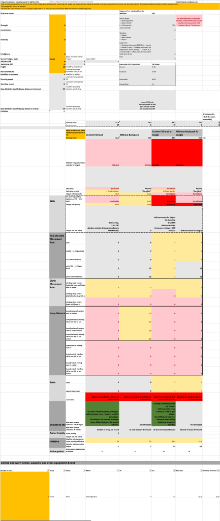 After filling out the FES – you can save a copy for each player character and start using it. During the scenario – when fatigue, speed or encumbrance matter – change the fatigue level and select whether you wear armor or not. If you are not satisfied with the numbers – drop or add equipment by adding or changing the item count number of each individual line you want or need to change in the equipment list. Only the orange fields are meant to be changed.