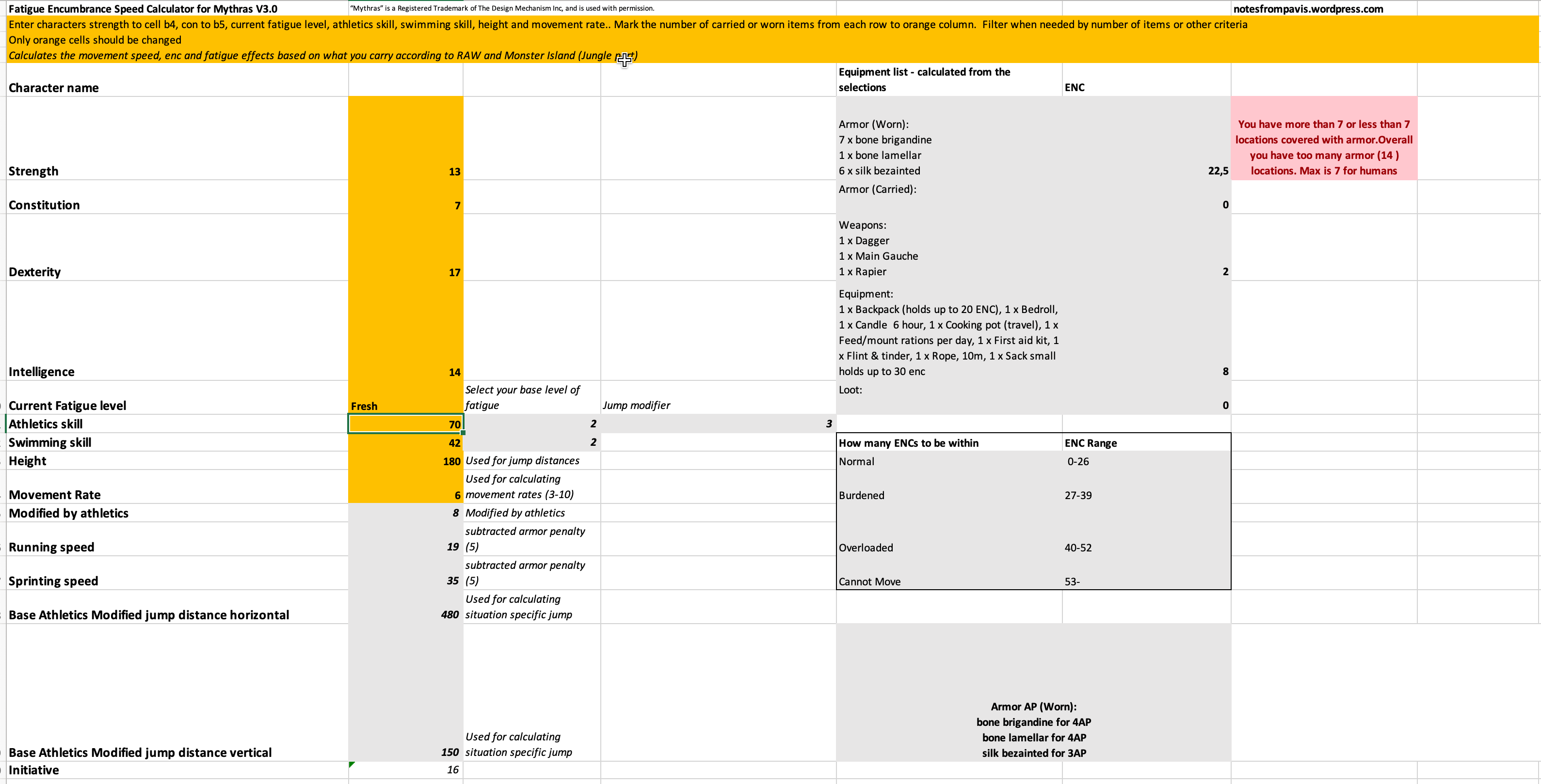 After filling out the FES – you can save a copy for each player character and start using it. During the scenario – when fatigue, speed or encumbrance matter – change the fatigue level and select whether you wear armor or not. If you are not satisfied with the numbers – drop or add equipment by adding or changing the item count number of each individual line you want or need to change in the equipment list. Only the orange fields are meant to be changed.
