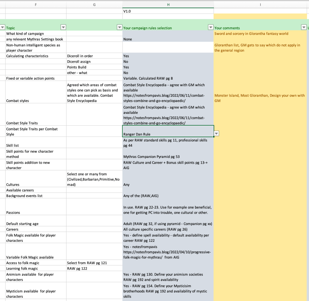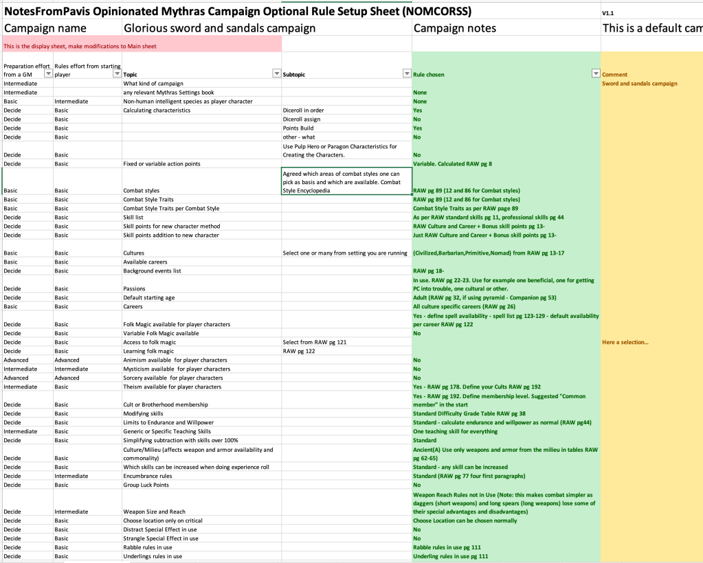 NOMCORSS V1.1 (NotesFromPavis Opinionated Mythras Campaign Optional Rule Setup Sheet) is expanded. It now contains more than 100 rules options scoured from Mythras RAW,Mythras Companion,Ships and Seawalls,Monster Island,Firearms,M-Space,Old Bones Setting Up Tasks,Adventures in Glorantha