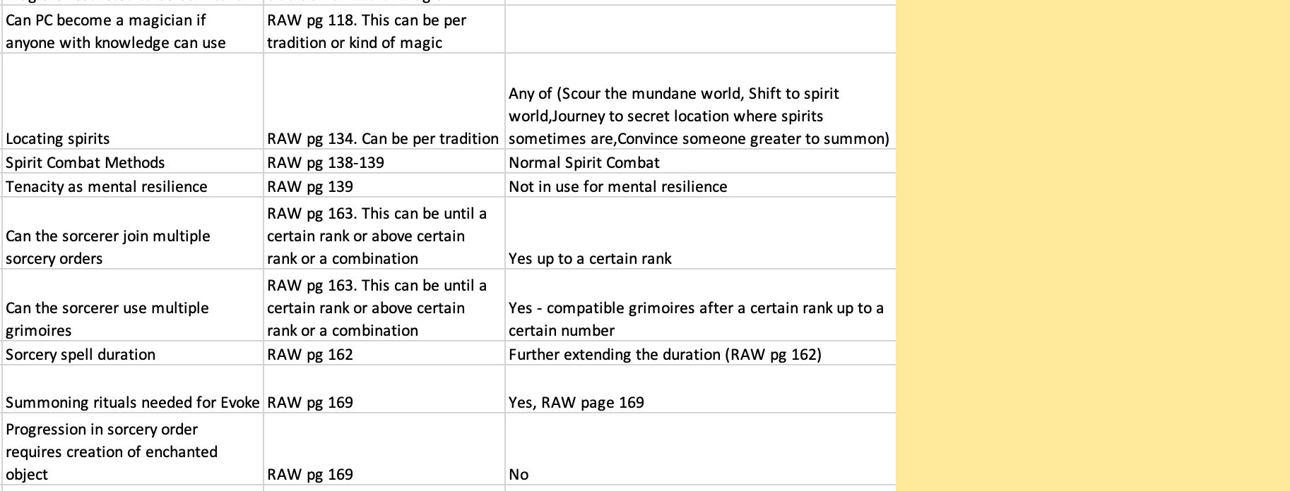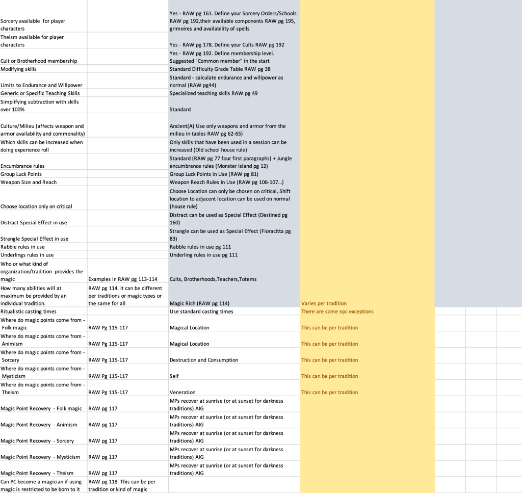 To help you select here are a few tips and an additional feature. First – select which of the magic systems you want to use. They are the rows marked with orange ones. If you select one or couple of them (by selecting from the green column any choice that is not “No” and not starting with “Standard RAW” – all the choices for any magic system rule choices will be marked “Optional Magic System Chosen”.