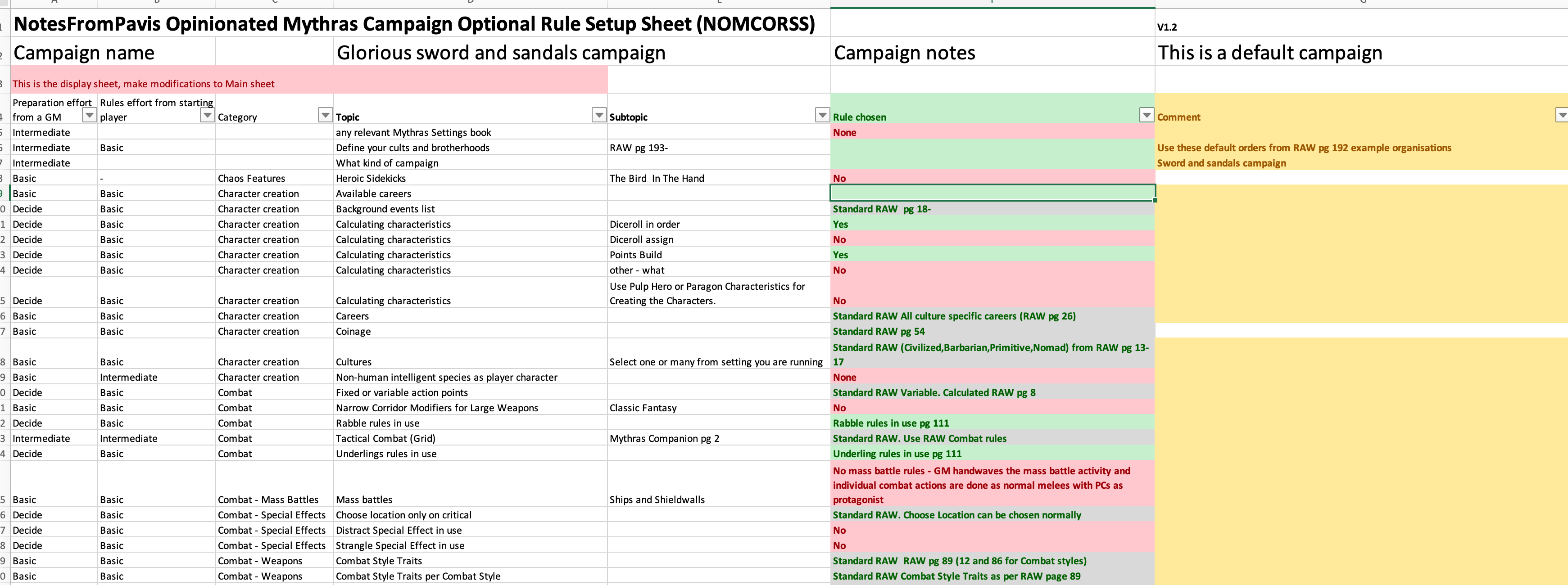 The display sheet shows now also “default” Mythras RAW options in gray, Not in use in red and the rest in green.