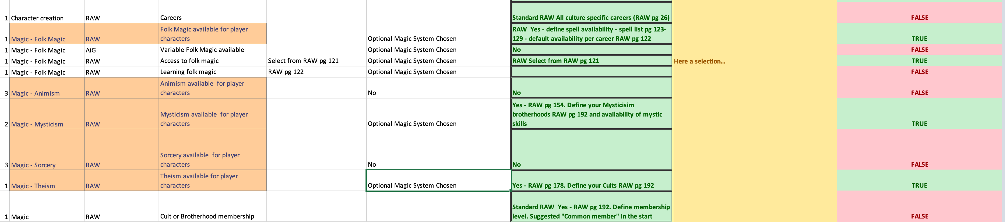 Now start selecting any of these “Optional Magic System Chosen” rules. There again if you select an option that is not “No” and not starting with “Standard RAW” the column named “Was there any optional rule chosen (rules that are standard in RAW count as False)” will be automatically marked True.