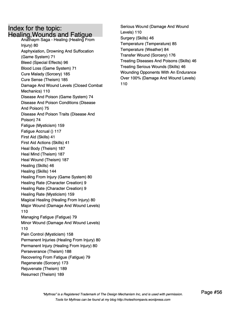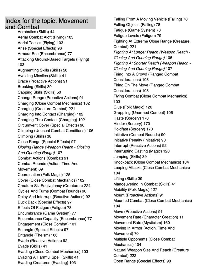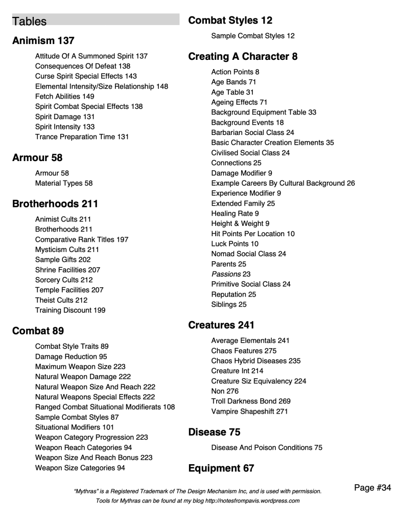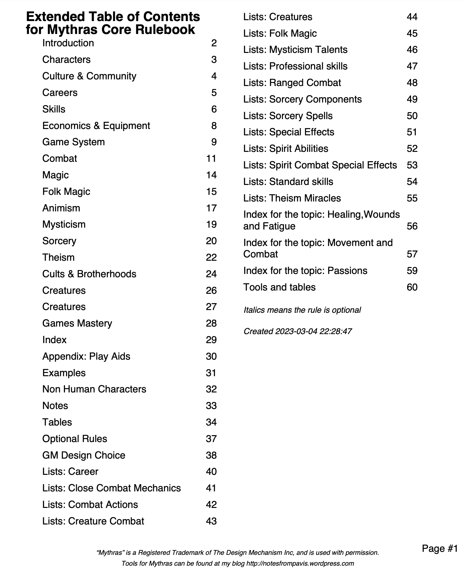 Here is for all new (and perhaps also old) Mythras Gamesmasters a very extended version of Mythras Core Rulebook Table of Contents as a pdf. It could be useful when trying to find a rule. You will need a version of the Core Rulebook as all the page numbers refer to that (except the ones on the very first page, which are page numbers for this Table of Contents). The additions at the end from Examples entry forward could also be used separately.