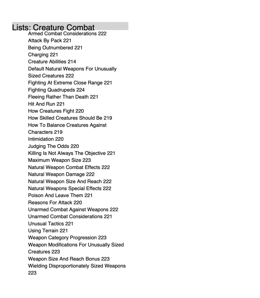 It also has a lists section which has a list plus page reference for list entries for each list in the book. Few examples below