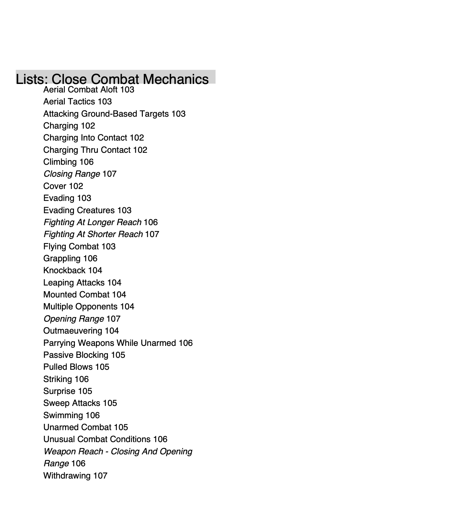 It contains table of contents that contains all the chapter headings from the Core Rulebook. Within the main table of contents all the optional rules are marked with italics