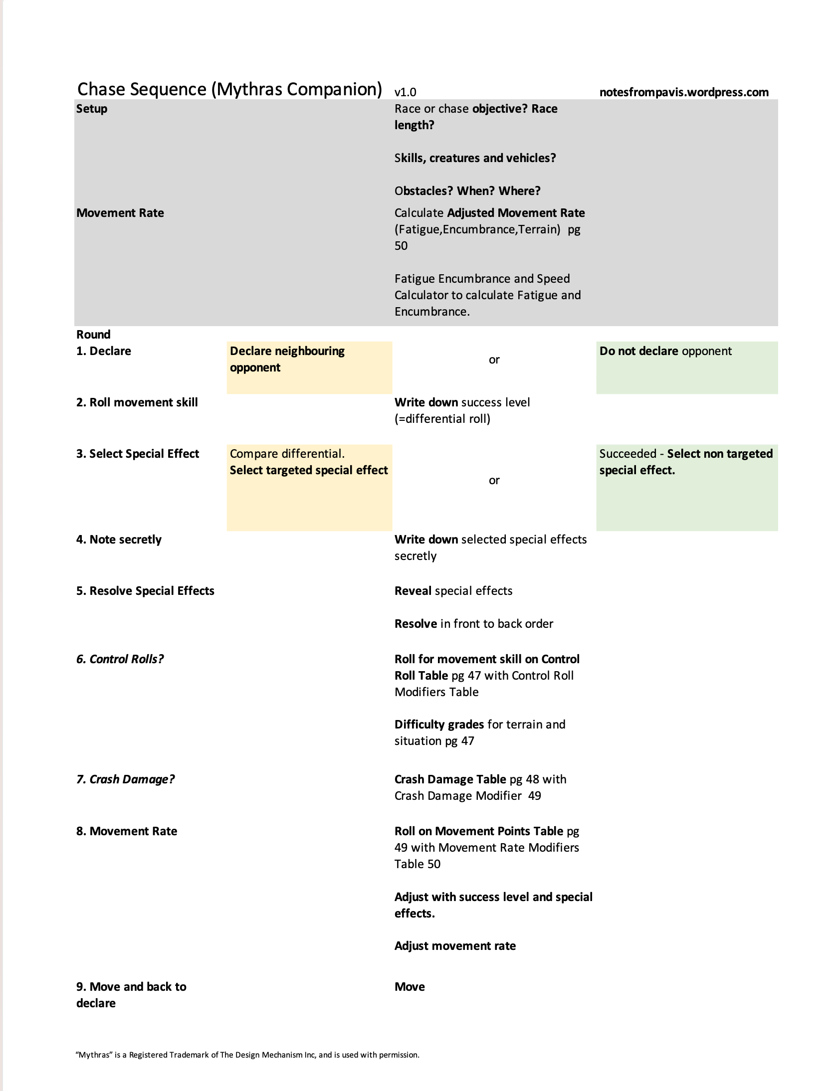One thing they currently lack is a quick reference so I decided to create one. There are two pages: the sequence page shows the round sequence for the chase with pointers to Mythras Companion pages for rules and tables.