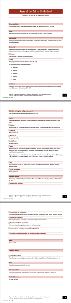 Here is a cult template (can also be used fro brotherhoods) for use in Mythras. It contains all the topics included in cults or brotherhoods section of Mythras and has as usually the permission of the Design Mechanism to use. I will probably provide example cult/s in the future
