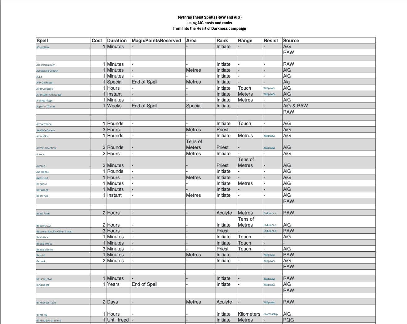 This first version contains theist spells from RAW rulebook, AiG, Thennla books, Fioricitta, Book of Schemes, Fenix papers and couple I have adopted in addition from RQ Glorantha. The ranks and spell costs are in this version from AiG also for RAW spells.