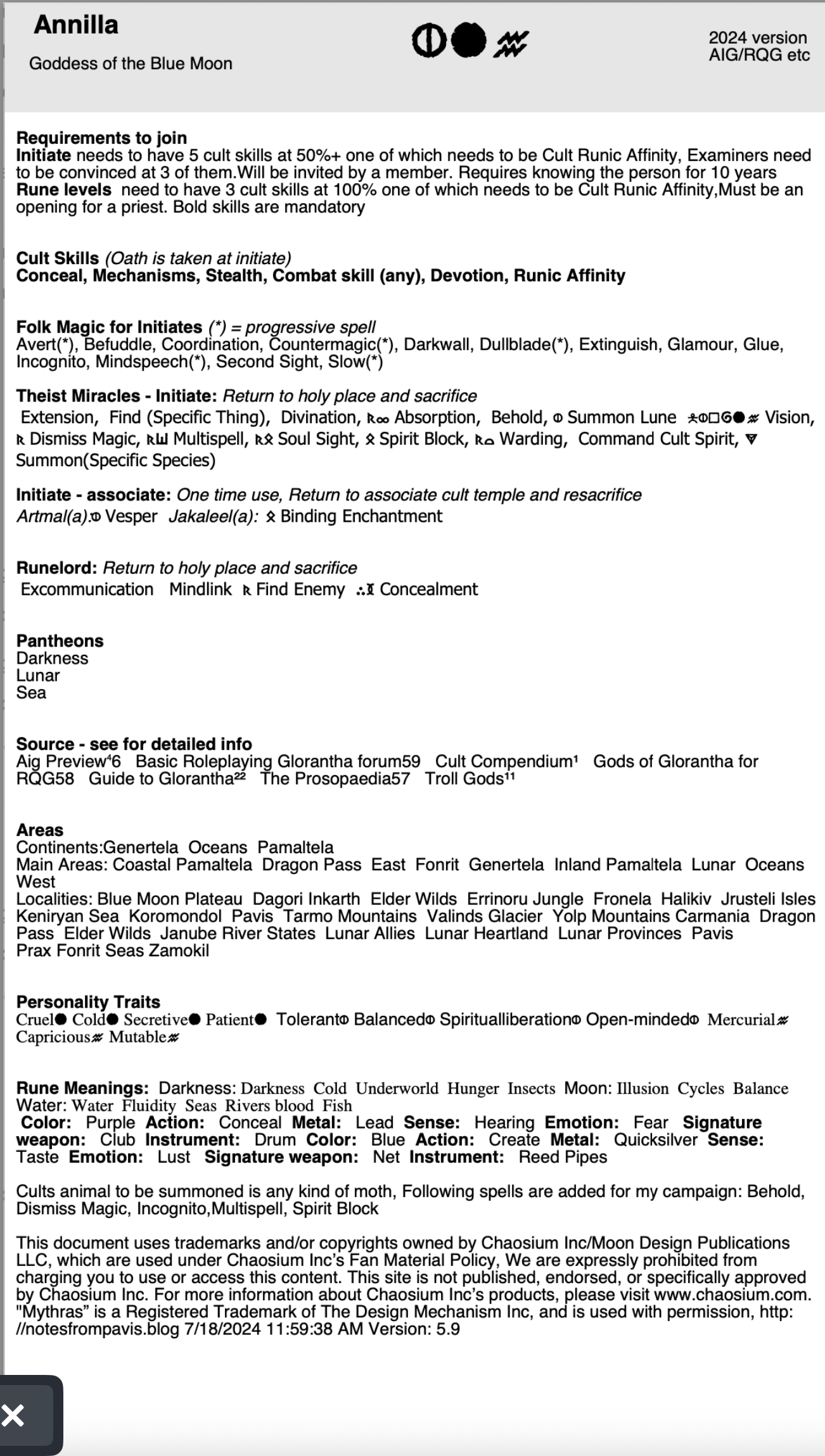There is a new version of Annilla that has taken into account the current understanding of what the cult has. In RQG there would be no MindLink or Mindspeech as they are embedded into the system there. I also added some spells (with a note which I added at the bottom) that I thought would be useful for what the cult presents.