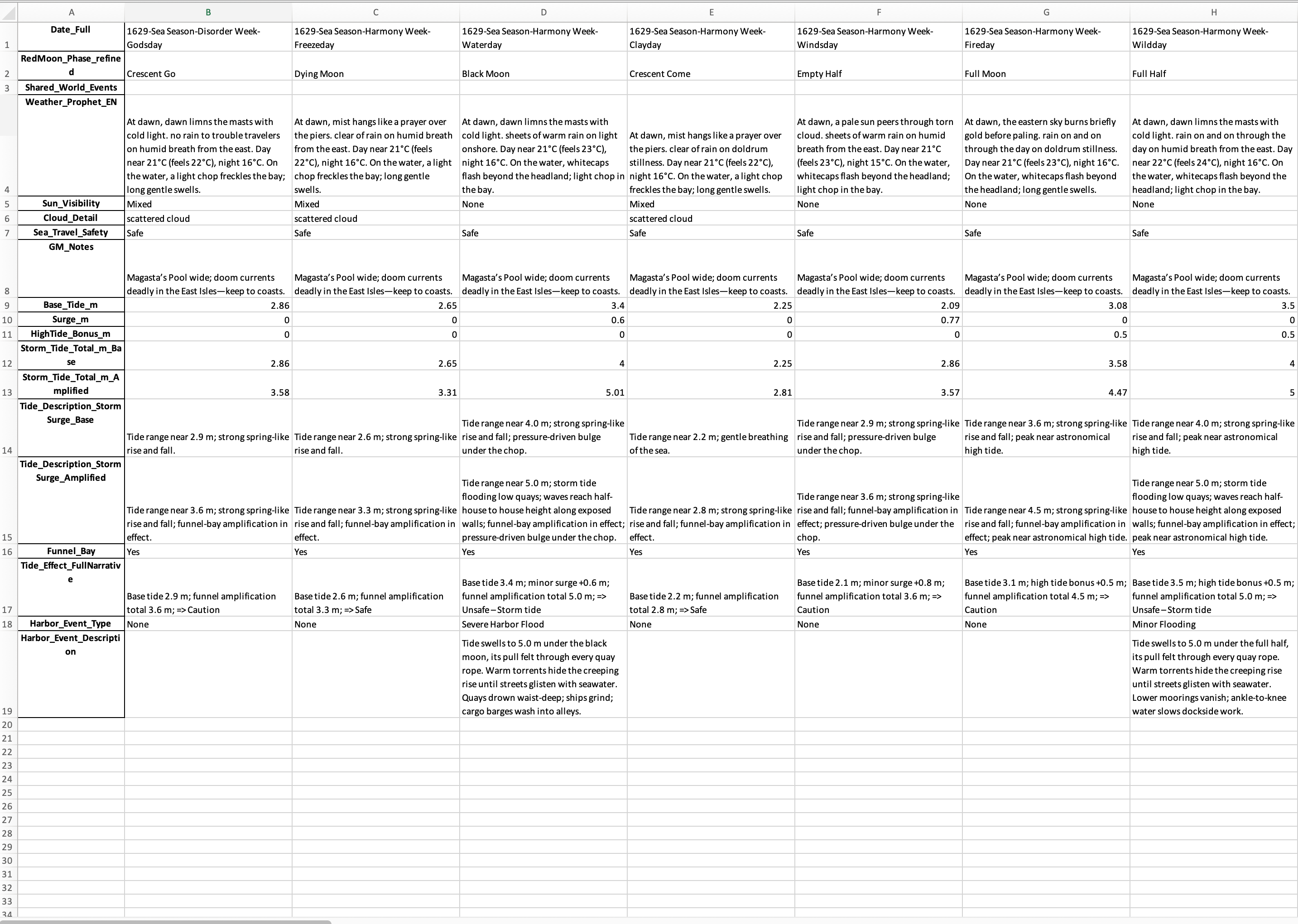 Here’s a field-by-field explanation of your weather/tides/events Excel structure, written with Gloranthan and sword-and-sorcery campaign use in mind.