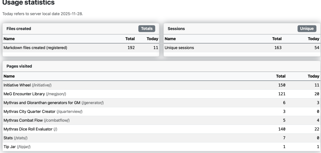 This summary covers updates released between Nov 23–27, 2025, plus one Generators UX change on Nov 26. All changes draw directly from user feedback and repeated tabletop use. The tools remain intended primarily for larger screens, but several areas now respond more smoothly when used on phones or tablets.