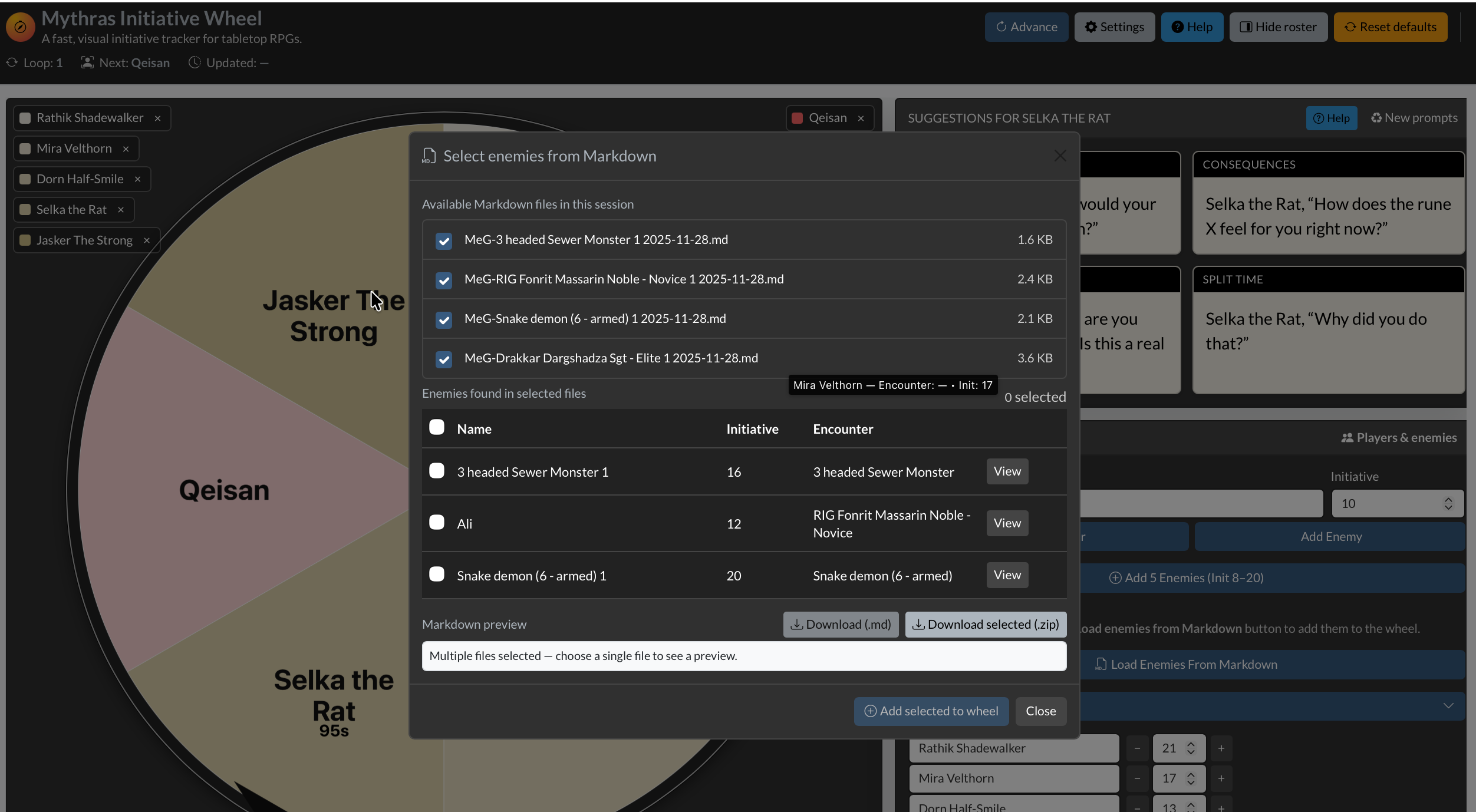 - Initiative Wheel: clearer turn cues, steadier roster behavior, tweakable suggestion batches, and import of enemies from Markdown created in the MeG Library.