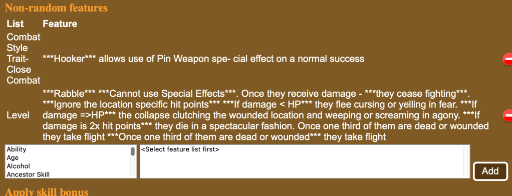 Here is a way to add specific feature. From Combat Style Trait-Close Combat feature list the Hooker is chosen as well as from Level list the Rab´ble is chosen. You could add several from the ability list by clicking on the ability and selecting the one you want and add it with the button