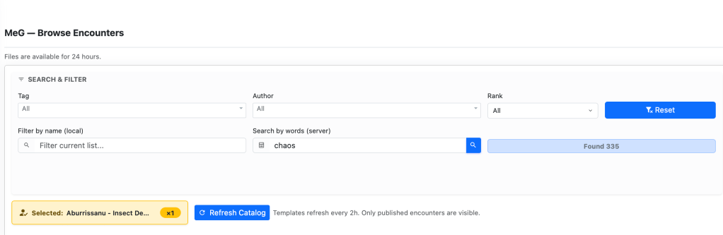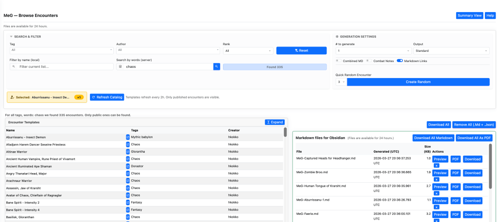 - Random Encounters. You can now trigger random encounter generation directly from the MeG library interface – select your tags for example Tag “All” Author All Rank All and filter by name: “Troll” and search by words “chaos”. Then in the generation settings the count of how many to create for each encounter 2 and how many random encounters you will get 3.